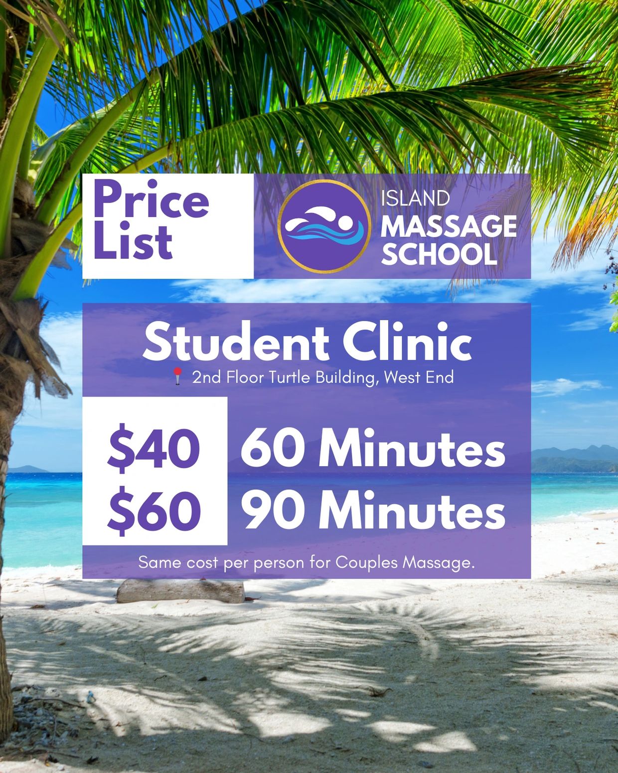 Our massage school and clinic is located on the second floor of the Turtle Building, beside Petrosun West End, Roatan. Massage appointments are by reservation only.